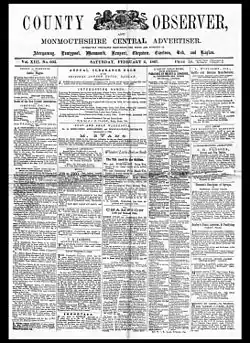 Welsh Newspapers Online has digitised 1,095 issues of the County Observer and Monmouthshire Central Advertiser (1867-1908) from the newspaper holdings of the National Library of Wales.[1]