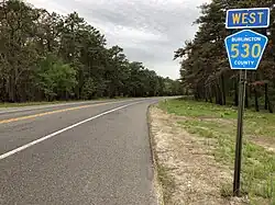 County Route 530 (CR 530) is a county highway in the U.S. state of New Jersey. The highway extends 31.21 miles (50.23 kilometers) from US 206 and Route 38 in Southampton Township to Water Street (Route 166) in Toms River Township.