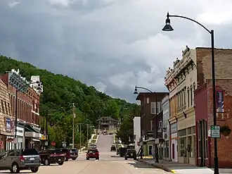 The town grew slowly until the mid-1870s due to lack of good transportation. In 1856 the Milwaukee and Mississippi Railroad had built its line along the Wisconsin River valley to the south, bypassing Richland Center, and refused to build a spur up to the town. In the early 1870s the town finally built its own spur 16 miles down the Pine River valley to Lone Rock - 16 miles of wooden narrow-gauge track.[4] With that connection to the outside world completed in 1876, the town began growing faster, with the downtown expanding east into what is now the historic district.[2]