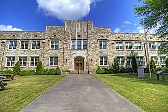 Cove Creek High School, also known as the Cove Creek Elementary School, is a historic high school building located at Sugar Grove, Watauga County, North Carolina. It was built by the Works Progress Administration in 1940–1941, and is a two-story, Collegiate Gothic style stone building. It is seven bays wide and features slightly projecting square stair towers and a crenellated roof parapet. It was designed by Clarence R. Coffey, an apprentice of Frank Lloyd Wright, and constructed by local artisans and laborers using local stone and wood sources.[2]