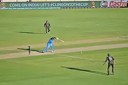The cover drive in cricket is the act of stroking the ball through the covers with well-timed wristwork and conventional movement of the front foot toward the pitch of a delivery aimed at or outside the off stump.[1] The cover drive is considered one of the most graceful shots playable in the sport.[2] Batsmen able to master the cover drive are usually given especially high praise because of the shot's difficulty in execution and its requirement for exquisite timing. When played to perfection, the cover drive comprises a batsman's seemingly effortless wielding of the blade in a downward trajectory through the off side, with the cricket ball gliding through infielders in the covers at pace toward the boundary at deep cover.