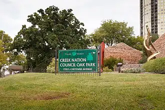 - ^ a b c "Creek Nation Council Oak Park," 1750 South Cheyenne Avenue, Tulsa Oklahoma, midtown Tulsa." Cain, Lori. May 21, 2010 Retrieved October 13, 3014.