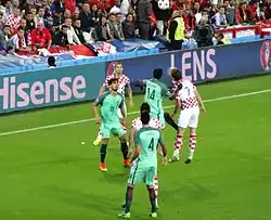 During the qualifying campaign of Euro 2016, Croatia drew with Azerbaijan and lost to Norway,[98] leading to Kovač's replacement with Ante Čačić.[99][100] The team broke their record for most goals scored in a match with a friendly 10–0 win over San Marino in June 2016.[101] They topped the group stage of that year's Euros, advancing with defending champions Spain.[102][103] Croatia prevailed over Turkey 1–0 with a long-range volley goal from Luka Modrić,[104] before drawing 2–2 draw against the Czech Republic.[105] In the latter match, Croatia led with goals from Ivan Perišić and Ivan Rakitić, while opposing Czech striker Milan Škoda and a last-minute penalty from Tomáš Necid drew the match.[106] There was severe crowd trouble[106] and on-field flares in the game's last minutes with a steward injured by a stray firework.[107] Croatia then defeated Spain 2–1, confirming the Spaniards' first defeat at a Euro finals match since 2004.[108][109] The Croatians were tipped as one of the tournament favourites[110][111] as they entered the knockout stage with Portugal.[112] The Portuguese prevailed 1–0 with Ricardo Quaresma's winning goal in the 117th minute after Perišić hit the post with a header in the previous attack.[113][114] Following the campaign, Darijo Srna announced his retirement and the succession of Modrić as team captain in August 2016.[115][116]