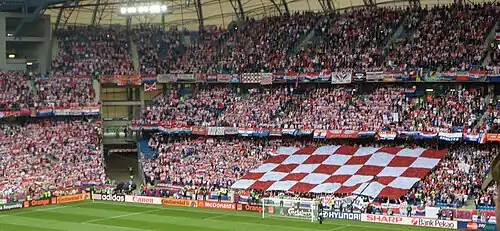 The Croatian Football Federation endorses an official fan club for the team, known as Uvijek Vjerni ("Always Faithful").[211] A part of the team's support consists of fans of Dinamo Zagreb and Hajduk Split, the two largest clubs in Croatia's top domestic football league, the Hrvatska nogometna liga (HNL).[212] Both sets of fans—Bad Blue Boys from Zagreb and Torcida from Split—have been associated with hooliganism due to their ultra-style support.[213][214] Regional support for the team also comes from Croats of Bosnia and Herzegovina, particularly from fans of domestic clubs Zrinjski Mostar and Široki Brijeg.[215] The diaspora of Croatians across the United States, Canada, Australia, and South America contribute to the majority of the side's international support.[216][217] It is customary among supporters to include an inscription of their city of origin onto the Croatian flag. Fans also coordinate their vocal support and orchestrate chants during matches. One section may shout "U boj, u boj" ("To battle, to battle") with another responding "Za narod svoj" ("For our people").[218] In addition to chants, the team regularly have songs dedicated to them, such as Slaven Bilić's "Vatreno ludilo" (Fiery Madness) which topped Croatian music charts during Euro 2008.[219][220]