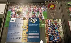 Croatia began their qualification campaign for the 1998 World Cup with an aggregate victory against Ukraine in the two-legged playoff. In the group stage, Croatia beat both Jamaica and Japan, later losing to Argentina to advance with them to the knockout stage. A 1–0 victory over Romania moved the Croatians to the quarter-finals against Germany.[33] Croatia beat the Germans 3–0 with goals from Robert Jarni, Goran Vlaović and Davor Šuker, all after Christian Wörns had been sent off.[34] They advanced to their first semi-final against hosts France.[35] After a goalless first-half, Croatia led after Aljoša Asanović pushed past Zinedine Zidane to cross a ball downfield to Šuker who scored after a one-on-one with goalkeeper Fabien Barthez.[36] France's defender Lilian Thuram equalized quickly after, and scored another goal later in the game to beat Croatia 2–1.[37] In the third place match, Croatia prevailed against the Netherlands 2–1 to secure bronze and claim their first World Cup medal.[21] Šuker won the Golden Shoe for scoring the most goals in the World Cup: six goals in seven games.[38] The Croatians' performance during the late-1990s propelled them to rank third place in the FIFA World Ranking in January 1999.[24][13] The team of the 1990s was dubbed the "golden generation"[a] for their contributions to Croatia's ascension in international football.[39][40]