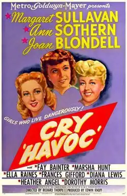 Cry 'Havoc' is a 1943 American war drama film, produced by Metro-Goldwyn-Mayer and directed by Richard Thorpe. It stars Margaret Sullavan, Ann Sothern and Joan Blondell, and features Fay Bainter, Marsha Hunt, Ella Raines, Frances Gifford, Diana Lewis, Heather Angel, Dorothy Morris and Connie Gilchrist.