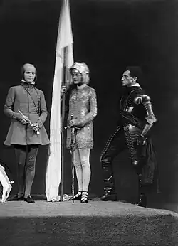 French novelist, playwright and actor Philippe Hériat played the part in Marco de Gastyne's Saint Joan the Maid in 1929.[87] The character plays an important role, personifying all the brutish soldiers that Joan of Arc (Simone Genevois) must unite under her banner. According to the review published at the time in Cinémagazine, Hériat's performance was "remarkable for its truth, intelligence and psychological subtlety. If his Gilles de Rais sums up all the vices of an era, he also has its faith."[88][89]