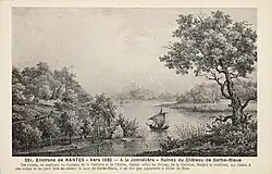 The written record of this confusion dates back to 1820, the year of publication of the "Description de la rivière d'Erdre depuis Nantes jusqu'à Nort" ("Description of the Erdre river from Nantes to Nort"), a letter subsequently included in the book Voyage pittoresque dans le département de la Loire-Inférieure. In this account of his journey through what is now the Loire-Atlantique department, writer Édouard Richer was the first author to mention, in print, a popular assimilation between Gilles de Rais and Bluebeard. According to vernacular accounts, a legend was rooted in the remains of La Verrière castle on the banks of the Erdre, although these ruins were located outside Gilles de Rais' historic domains: seven large trees stood there like monuments of expiation allegedly dedicated to the memory of the fabled wives murdered by the local lord.[37][38]
