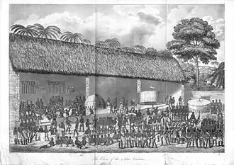 These were elevated mounds built out of sun-baked clay that served as a platform for the Asantehene to sit and preside over public rituals in Kumasi.[36] The earliest description of the sumpene comes from Bowdich's journal in 1819 where he observed circular elevations of two steps, "the lower about 20 feet in circumference, like the bases of the old market crosses in England." These were raised in the middle of several streets and the King's chair was placed on this platform to sit. From which he would drink plam wine with his attendance encircling him. Freeman also observed that the sumpene were polished with red ochre and they stood between 6—8 feet tall and around 10 feet in diameter at the apex. He adds that "they are ascended by pyramidal ledges, or steps running all around and rising above one another, about a foot in depth, and 18 inches in width. Around these ledges the officers of the Household, with attendant domestics take their seats and thus a group is formed of from fifty to a hundred persons all distinctively seen."[37]