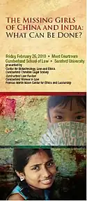 This Conference is being held on February 26, 2010 at Cumberland School of Law in Birmingham, Alabama to discuss the causes and socio-economic impact of "missing girls" in China and India. "In China, approximately ten percent of females have disappeared from the population at birth in last generation alone. Similarly, about five percent of female are "missing" from India's population. Collectively, this indicates a loss of tens of millions of Chinese and Indian females which creates significant socioeconomic complications. The sex-ratio imbalances in China and India have grown worse despite successful economic development and pressures toward cultural modernization. Scholarship on "the missing girls" of China and India has been increasingly successful in documenting and identifying some of the most direct causes. The purpose of this symposium is to gather and urge a group of the leading scholars to discuss remedies to the problem of missing girls." [19]