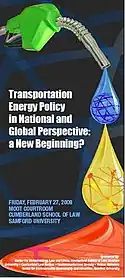 This Conference was hosted on February 27, 2009 and its stated purpose was that: "The public in the United States and throughout much of the world has become keenly aware of the limitations of continued reliance on petroleum-based fuels. Concerns over diminishing supplies, growing demand, price instabilities, environmental impacts, international competition for limited resources, energy security, and the costs of foreign involvement necessitated by our "addiction to oil" have created an imperative toward renewable energy. Yet, some view the United States' first major venture into renewable fuels, corn-based ethanol, as a failure that has contributed to higher food prices and brings little overall environmental or supply gain. Political and popular rhetoric suggests that a technological fix, in forms such as second-generation biofuels, fuel cells, electric cars, or a hydrogen economy are just around the corner, and yet most estimates posit that petroleum based fuels will predominate for at least several more decades. President Barack Obama has promised a new and different energy policy. This conference, taking place a little more than month into the new administration, will look at the possibilities for transportation energy policy both for the United States and other nations. Upon examination, government has a limited set of tools it can use to promote a transition to renewable energy and promote energy conservation/efficiency. Options include subsidies or tax credits for renewable energy, taxing carbon-based energy, funding research, promoting/funding/designing for mass transit, renewable fuel standards, CAFÉ-fuel efficiency standards, and mandating that energy efficient/alternative energy cars be built in exchange for financial help for the car industry. These issues of supply, demand, price, security, nationalism, and environment occur within an interdependent world. Hence, this conference will look beyond the United States to transportation energy policy throughout the world."[20]