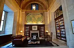The main entrance is from Broadway, through the three center arches, each of which contains a small entrance vestibule inside. The vestibules and the two outer arches all lead to the building's main lobby.[39] The lobby contains a ceiling of five groin vaults, each of which correspond to one of the arches on the Broadway facade. The floors are made of travertine with marble trim and contain maritime-themed bronze medallions. The walls are also made of travertine; there is a fireplace on the southern wall and a roll-down gate and doors on the northern wall.[32] A passageway runs along the western wall of the lobby, connecting the northern four bays to the Great Hall to the west.[39] The building's original owners had decided against putting "miscellaneous minor business adventures" in the lobby, such as newsstands, shoe-shine stands, and cigar shops.[37][40]