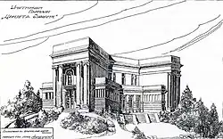 Two years later, at the end of 1925, the Art Division of the Ministry of Education announced the competition for the construction of the new exhibition space. The pavilion should have been erected the immediate vicinity of Princess Ljubica's Residence.[7] The architect Branislav Kojić won the first prize at the competition, the second one won the architect Milan Zloković and the third won the architect Мihailo Radovanović.[8] After the competition, the Belgrade Municipality decides to concede the building plot to the association, yet not in the site next to the Konak, but in Little Kalemegdan.[4] Due to this change, Branislav Kojić had to change the awarded design in order to harmonize it with the new circumstances, since his design was related to the Konak. Something completely different, contemporary and modern, was expected from Kojić.