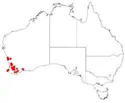 This boronia grows on rises and outcrops in gravel or over laterite between Eneabba and Ongerup in the Avon Wheatbelt, Esperance Plains, Geraldton Sandplains, Jarrah Forest, Mallee and Swan Coastal Plain biogeographic regions.[2][3]