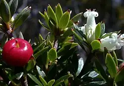 Cyathodes straminea is a shrub with leaves arranged in pseudowhorls. Leaves are obovate-elliptic 7–16 mm long, 3-4.5 mm wide, often with a membranous margin, and a soft, blunt point. The upper surface is glabrous, but the lower surface is covered in white wax (glaucous) with prominent parallel veins (Fig.1). Petiole 1.6-2.4 mm long.[1] The flowers occur in summer in upper leaf axils (Fig.2) and have a strong cheesy smell, are white, bell-shaped and hermaphrodite (both male and female) with long corolla lobes and anthers exserted on thick filaments. They have 5-10 locules in the ovary,[2] developing into red, rounded, flattened fruits to 8mm wide, reputed to be edible (raw or cooked) (Fig.3).