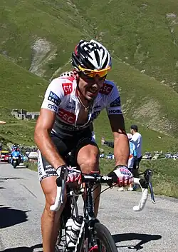 Among the pre-race favorites was the entire Spanish contingent of riders.[19] It included two winners of Grand Tours in Alberto Contador and Carlos Sastre, along with highly regarded countrymen Alejandro Valverde, winner of the 2008 Critérium du Dauphiné Libéré and the reigning Spanish national road race champion, and Samuel Sánchez, who had won three stages in the 2007 Vuelta a España. They also had 2008 Tour de France points classification winner and three-time world champion Óscar Freire available to work on their behalf. Valverde was seen as the strongest threat among the Spaniards.[20][21][22] Other medal hopefuls included the defending Olympic champion Paolo Bettini of Italy,[21][23] Germany's Stefan Schumacher,[24] and Australian Cadel Evans, twice a runner-up in the Tour de France (2007 and 2008). It was thought that members of the overall strong squads from Germany and Luxembourg could also contend for victory.[25] The German team contained Schumacher and many veterans of Grand Tours such as Jens Voigt to work in support, while Luxembourg had the Schleck brothers Andy and Fränk, along with Kim Kirchen, all of whom had worn leader's jerseys during the 2008 Tour de France.[26][27]