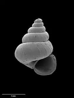 The shells grows up to 1.75–2.90 millimetres (0.069–0.114 in) in height, and have a larger height than width. The shell is coloured reddish brown.[1]