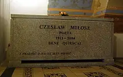 Miłosz's sarcophagus. The Latin inscription reads "May you rest well"; the Polish inscription reads "The cultivation of learning, too, is love."