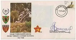 Danie Theron Combat School was established near Kimberley around 1967, aimed at primary infantry training for the Commando system. The school was initially called the Commando Combat School, but by 1968 was renamed in honour of Danie Theron , a renowned Boer war soldier.