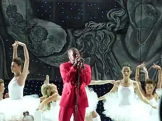At the 'Vevo Presents GOOD Music' musical presentation, the song was performed by both West and Taylor.[31] The performance began with West's silhouette pressed against a glowing background, dressed in all black.[31] During his set at the Coachella Valley Music and Arts Festival, West performed "Dark Fantasy" as the opening track.[32][33]