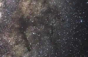 The Dark Horse Nebula or Great Dark Horse (sometimes called the Prancing Horse) is a large dark nebula that, from Earth's perspective, obscures part of the upper central bulge of the Milky Way. The Dark Horse lies in the equatorial constellation Ophiuchus (the Serpent Bearer), near its borders with the more famous constellations Scorpius and Sagittarius. It is a large, visible feature of the Milky Way's Great Rift, uniting several individually catalogued dark nebulae, including the Pipe Nebula. It is visible from Earth only on clear moonless nights without light pollution and with low humidity.[1]