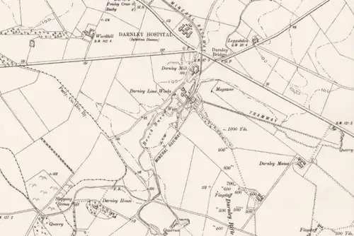 The second edition of the Ordnance Survey map (1896–1899) shows the quarry picked up by Ainslie on the site of today's interchange No. 3 of the M77 motorway, from which the Tramway ran to the limestone kilns of Darnley Lime Works east of Brock Burn, located just south of today's World Buffet restaurant at the junction of Corselet Road and Nitshill Road.