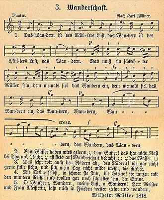 The poem was first set to music by Franz Schubert in 1823, titled "Das Wandern", as part of his song cycle Die schöne Müllerin, together with 19 other poems from the cycle.[4] Several others set it to music, including Heinrich Marschner,[6] Otto Nicolai and Karl Hellmuth Dammas.[7]