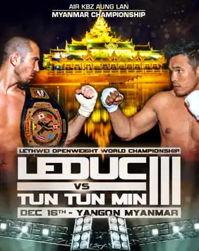 Dave Leduc vs. Tun Tun Min III, also known as The Biggest Fight In Lethwei History,[3][4][5] was a Lethwei world title match between reigning Openweight Lethwei World Champion Dave Leduc and former Openweight Lethwei World Champion Tun Tun Min that took place at Thein Pyu Stadium in Yangon, Myanmar, on December 16, 2018.[6]