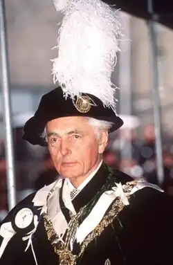 In 1984, Lord Airlie resigned from Schroder to take up the position of Lord Chamberlain of the Household, the most senior office in the Royal Household.[7] He was sworn into the Privy Council and appointed a Knight Grand Cross of the Royal Victorian Order.[8] In his capacity as Lord Chamberlain, he was chancellor of the Royal Victorian Order. He was following in the footsteps of his late father, who had served as Lord Chamberlain of Queen Elizabeth The Queen Mother's household.