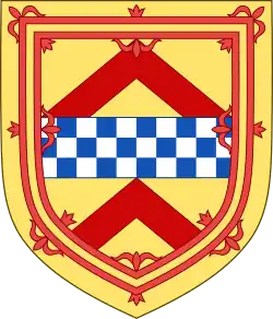 ![]() Coat of arms of David Stewart, Earl of Strathearn, combining the Royal tressure of Scotland, the 2 chevrons of Strathearn and the fess chequy of house Stewart | |