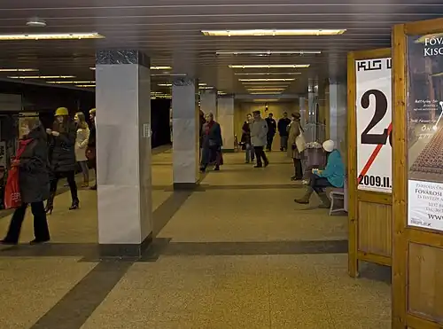 In 1976, the station became the northern terminus for the first segment of metro line M3, which opened on 31 December 1976 to Nagyvárad tér.[1] The line M3 platform has switches and a pullback track in a middle tunnel at its northern end. This track descends underground and curves more than 180° west to join the pullback track on the M2 line. This non-revenue connection tunnel was the means of supplying rolling stock to line M3 from 1976 until it was completed to Kőbánya-Kispest and the adjacent new depot in 1980. The extension of the line north, to Lehel tér was opened on 30 December 1981.[1] The station and its interchange passage to M2 was renovated between 7 November 2020 and 23 January 2023.