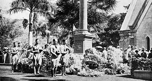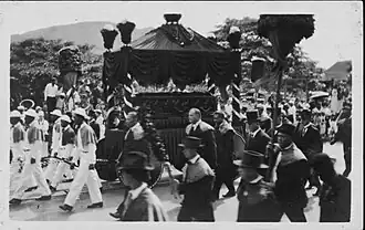 Following the raising of the royal standard, Hawaiian royalty and non-royalty arrived to pay their respects. The Hawaiian National Guard under Brigadier General Samuel Johnson was stationed at the gates. In accordance with Native Hawaiian tradition that dictated the body of a deceased royal could only be moved after dark, Liliuokalani's body was transferred under military guard at midnight on Monday along torch-lit streets to Kawaiahaʻo Church for embalming. On Tuesday, her body lay in state for 12 hours without a casket, covered only by a silk shroud, for the traditional Hawaiian mourning of chanting and wailing. Afterwards, the body was placed inside the casket for viewing until 6 p.m. on Saturday.[3][4] She received a state funeral in the throne room of Iolani Palace, on November 18, 1917.[6][7]