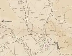 The 30–35 km (19–22 mi) long semicircular narrow gauge network with a track gauge of 600 mm (1 ft 11+5⁄8 in) from Narès (now Nea Filadelfeia, Νέα Φιλαδέλφεια) via Bumardza (now Bougaríevo, Μπουγαρίεβο), Sari-Omer (Σαρή Ομέρ), Inglis (now Anchialos, Αγχίαλος) and Topçin (now Gefyra, Γέφυρα) to Vatiluk (now Vathylakkos, Βαθύλακκος).[1]