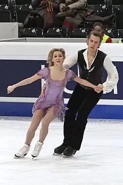 In 2006, Stagniūnas formed a partnership with American Katherine Copely. They became the 2007 Lithuanian national champions and 2006 and 2007 Golden Spin of Zagreb bronze medalists. The duo qualified an entry for the 2010 Winter Olympics in the ice dancing event when they placed 14th at the 2009 World Championships.[4] According to IOC rules, competitors must have citizenship of the country they are representing; however, Copely's special request for citizenship was denied by Lithuanian President Dalia Grybauskaitė.[5] The spot was left unfilled. Copely retired from competition due to an injury which was subsequently treated arthroscopically, followed by a complete recovery. She is currently attending medical school in the U.S.[1]