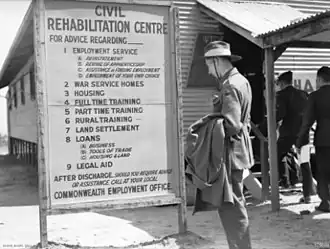Demobilisation also included establishing arrangements for the medical care of ex-service personnel. After the war responsibility for medical treatment was gradually transferred from the services to the Repatriation Commission. The Army's hospitals were also transferred to the Commission, meeting its immediate need for facilities. It proved necessary to build new hospitals for the treatment of tuberculosis and mental disorders, but as the specialised Army hospitals established for the treatment of the conditions were respectively unsatisfactory, they had to be returned to the Government of New South Wales.[18] The Department of Social Services was responsible for providing assistance to veterans with a disability not caused by their military service, which led to the foundation of the Commonwealth Rehabilitation Service in 1955.[19]