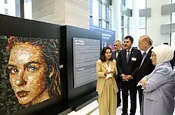 Emine Erdoğan presenting a painting by artist Deniz Sağdıç to Sheikha Moza
