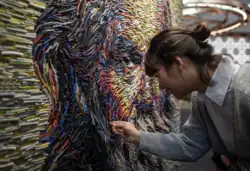 Deniz Sağdıç transforming waste collected at İGA Istanbul Airport Waste Systems into art, Istanbul, 2023