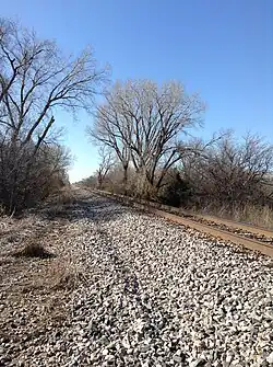 This section was taken out of service in 1994 due to flood damage on the Cimarron River bridge and a couple of other creeks near the bridge.[6] Although the blame for this abandonment is given due to a bridge washout at Cottonwood Creek it is more than likely due to the merger of the Burlington Northern Railroad and Atchison, Topeka and Santa Fe Railway. Trains from Enid now run on the Avard sub to Perry, Oklahoma and then "west" to Guthrie.[7] On October 23, 1998, the Surface Transportation Board approved the BNSF Railway request to abandon 42.80 miles of its line of railroad between milepost 73.60 near Fairmont and milepost 116.40 near Guthrie [8] The line was railbanked, and the Oklahoma Department of Transportation was designated as the holder of rights to develop it for trail use. On Feb 19, 2010, a petition was filed by Montoff Transportation, LLC, of Seattle WA, to acquire from BNSF its residual right to reactivate the line and from ODOT its right to develop a trail. The stated purpose at that time was to put the line back in service, and initially to develop portions of it for railcar storage.
