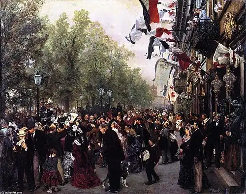 In this painting, Menzel depicts the boulevard Unter den Linden, in Berlin, in a strongly perspective composition. A huge crowd cheers the Prussian King Wilhelm I, who is sitting next to his wife in a carriage and is heading towards the Brandenburg Gate to reach the Berlin Potsdamer Bahnhof. Wilhelm traveled to the theater of war as commander-in-chief of the armies of the North German Confederation and the southern German states, whose deployment across the Rhine was almost complete. The Berlin Palace is in the background of the painting, but the other royal buildings, such as the royal operas don't appear at all. The tower of the recently completed Red Town Hall, on the other hand, is painted more clearly, which points to the increasing importance of the bourgeoisie after the war had been won (Menzel completed the painting in 1871 after the war). Both the shadowy castle and the town hall are the only buildings that can be clearly identified. The bourgeois facades on the right edge of the picture, on the other hand, are fictitious and appear oversized in their almost vertical perspective cornice line due to the strong view from below. With her neo-baroque decorations, it could be a depiction of an in the foreground; these building facades represent the prosperity of the self-celebrating bourgeoisie in a time of economic upswing.[5]