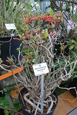Dermatobotrys is a rare plant genus endemic to coastal scarp forests in Madagascar and from southern Zululand to the Transkei in South Africa. It consists of a single species, Dermatobotrys saundersii, which is an epiphytic, deciduous shrub, of up to 1 metre (3.3 ft) in height, growing on trees or occasionally on the forest floor. Its flowers are tubular and deep red, followed by smooth, brownish fruit.
