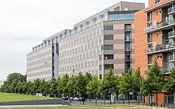 1980s residential building on the former location of the large Raiffeisenhaus at 39-43, Köthener Strasse in Berlin, which was entirely destroyed at the end of World War II; the adjacent Meistersaal is visible on the right -