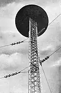 Because the mast was under high voltage during transmission, the aircraft warning lighting was realized in a very unconventional manner. On small poles near the mast multiple rotating searchlights were mounted which illuminated the lens-like structure on the top.