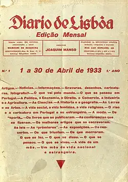The newspaper was founded on 7 April 1921 by Joaquim Manso, who ran it until he died in 1956. He was succeeded by Norberto Lopes between 1956 and 1967. It was published for the last time in 1990, when Mário Mesquita was the director. The company was owned by Renascença Gráfica and was edited in Rua Luz Soriano (Luz Soriano Street) in Lisbon. Since 2009, 500 copies of one annual issue have been printed in order to protect the rights to the Diário de Lisboa title.[1][2]
