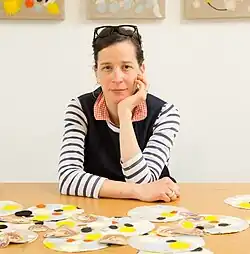 Diana Guerrero-Maciá (born 1966) is an American studio-based artist who has produced paintings, works on paper, prints and sculpture.[1][2][3] She is known for her hybrid or "unpainted paintings"—works constructed with fabric cutwork, collage, stitching and dye that collapse boundaries between the fields of painting, fiber and design and challenge distinctions between "high" art and craft.[4][5][6][7] Her largely abstract work samples and revises multiple materials, symbols and typography, and graphic elements such as grids, stripes and archetypal shapes to engage with color, iconography and diverse cultural movements and conventions.[8][9]