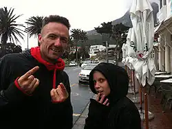 Die Antwoord formed in 2008 in Cape Town, then consisting of Jones, known as Ninja; du Toit, known as Yolandi Visser and stylized as Yo-Landi Vi$$er; and de Nobrega, the group's producer who went by the name DJ Hi-Tek.[17][18][19] Their name is Afrikaans for 'The Answer'.[20] They performed at the South African music festival Oppikoppi and released their debut studio album, SOS, in 2009.[21][22] The music video for their single "Enter the Ninja"—which starred South African DJ Leon Botha, who also opened for Die Antwoord's earliest concerts and was notable for being the oldest living person with progeria before his death in 2011 at age 26—was released in late 2009. Also released then was a short promotional video titled Zef Side, which was directed by Sean Metelerkamp and featured interviews with the group about their fictitious origin story in a public housing suburb as well as their song "Beat Boy", which samples the 1986 Bronski Beat song "Hit That Perfect Beat".[23][24][25][7] Both videos went viral online after being posted on their website, dieantwoord.com, and shared on blogs such as Boing Boing and Dlisted in February 2010, bringing them attention internationally on social media platforms such as Twitter, Facebook, and YouTube.[18][26][27] By the end of 2010, "Enter the Ninja" had received over eight million views on YouTube and was named Myspace's Video of the Year, while Zef Side had over five million views and was one of 25 videos selected for the Guggenheim's YouTube Play exhibit, which showcased video art from YouTube.[28][25]