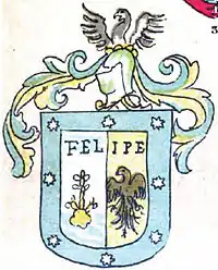 On 23 December 1546, a cédula was issued by Charles V and his mother Joanna granting don Diego a personal coat of arms in recognition of his service, particularly in the war in Nueva Galicia, and so that "other [Indian] nobles will be inspired to serve us". His arms included the indigenous symbol of Tenochtitlan — a prickly pear cactus growing out of a stone in the middle of a lake — which would centuries later feature in the coat of arms of Mexico, as well as an eagle that may represent Huitzilopochtli.[3]