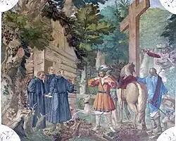 Margrave Diepold III of Vohburg-Cham meets his former friend Gerwig as hermit in the woods. Fresco in 1698, in the Waldsassen Abbey
