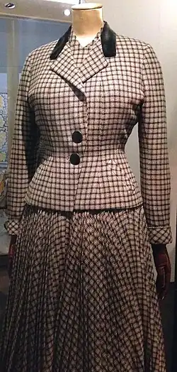 Digby Morton remained active during the war as a couturier, charging at least £25 for a good quality tweed suit.[6] But he also responded to the wartime need for well designed and affordable clothing. As a founder member of the Incorporated Society of London Fashion Designers (IncSoc), he was among those invited by the Board of Trade to design for wartime, respecting the strict guidelines of rationing and utility.[7][8] His contributions included designing outfits for the WRVS.[2] Among his other notable wartime creations was a designer version of the siren suit (a utility boilersuit designed for air raids and work) commissioned by Viyella and made in its cotton/wool mix fabric.[9]