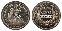 Thirteen stars (symbolizing the 13 original colonies) were added to the perimeter of the obverse in 1838.[11] These were replaced with the legend "United States of America," which was moved from the reverse in mid-1860. At the same time, the laurel wreath on the reverse was changed to a wreath of corn, wheat, maple, and oak leaves and expanded nearly to the rim of the coin. This reverse design continued through the end of the series in 1891 and was changed only slightly in 1892, when the Barber dime debuted. Another variety is the 1838–40 dime minted with no drapery underneath the left elbow of Liberty.[3]