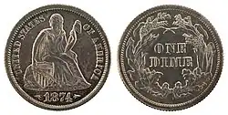 The obverse features an image of Liberty sitting on a rock, wearing a dress and holding a staff with a liberty cap on top. Her right hand is balancing a shield with the inscription "LIBERTY." The reverse featured the inscription "ONE DIME," surrounded by a wreath. All Seated Liberty dimes contain 90% silver and 10% copper, and are 17.9 millimeters (0.705 inch) in diameter. This size and metal composition would continue until 1965, when silver was permanently removed from circulating dimes.[10]